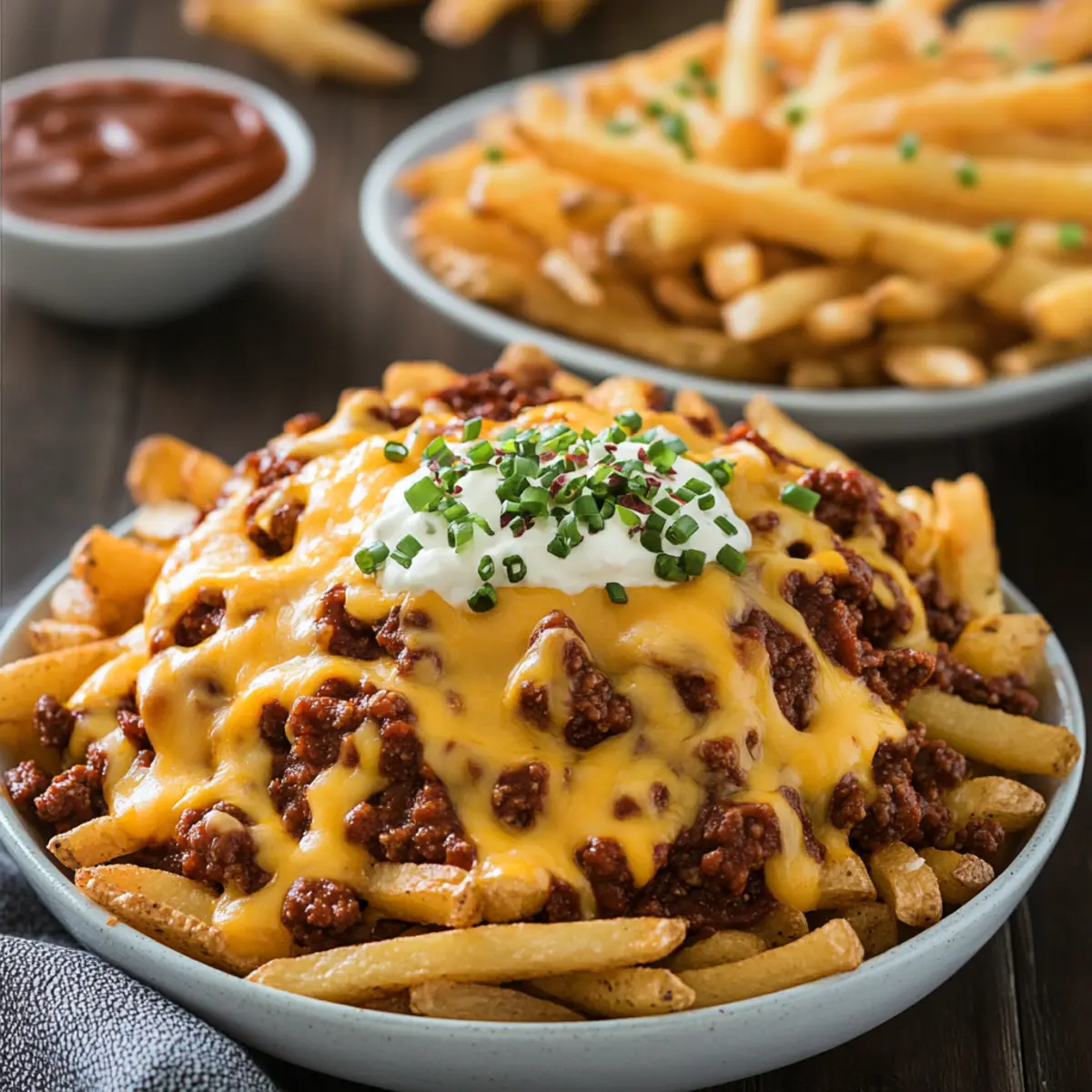 - Assemble this masterpiece. Pile those beautiful fries high, spoon the cheesy chili over them, and serve immediately.